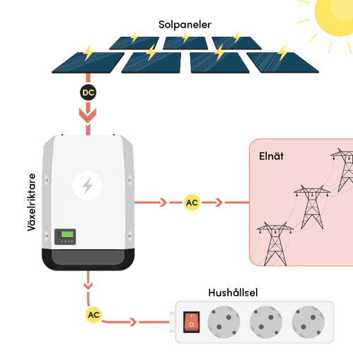 Växelriktaren omvandlar likströmmen till växelström så att elen kan användas i hushållet, fastigheten eller matas ut på elnätet.