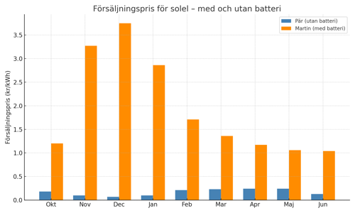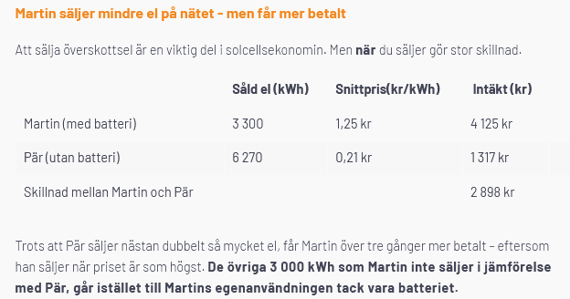 Pär och Martin använder ungefär lika mycket energi i sina hushåll, och solcellsanläggningarna producerar lika mycket, men ändå köper Martin ca 3 000 kWh mindre el från nätet än Pär. Detta beror på att Martin kan ladda sitt batteri med solenergi istället för att sälja detta ut på nätet, som blir fallet för Pär. Detta ger Martin en stor kostnadsbesparing: