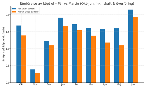 - Martins genomsnittliga Elpris Oktober 2024-Juni 2025:1,39 kr/kWh inkl påslag, elöverföringsavgift och energiskatt
