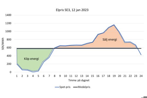Elprisarbitrage innebär att du utnyttjar skillnaderna i elpriser mellan dag och natt. Ladda ditt batteri när elpriserna är låga, exempelvis på natten, och använd den lagrade elen när priserna är högre. Detta sätt att använda ditt batteri kan maximera dess effektivitet och hjälpa dig att spara pengar jämfört med att endast förlita dig på direktanvändning av solenergi och köp från nätet.