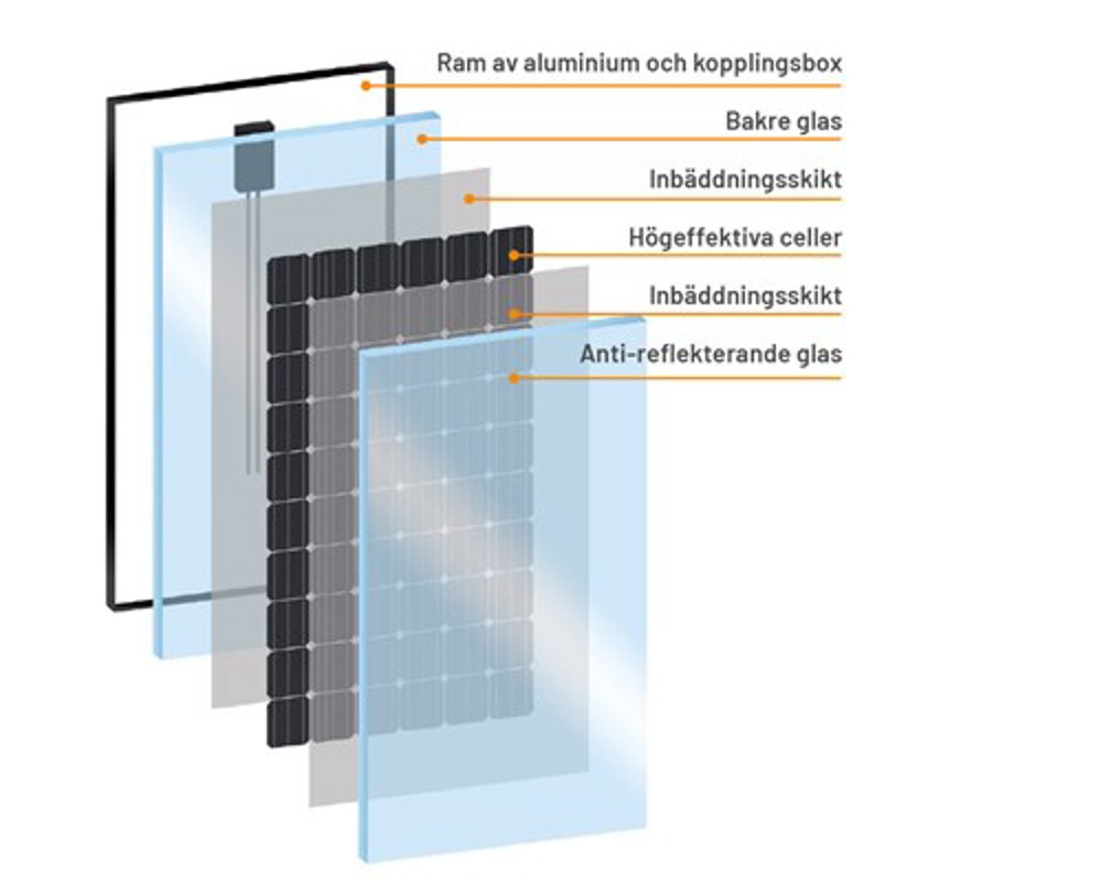 Glas-Glas solcellsmoduler är unika, de har förutom högre elproduktion, en betydligt längre livslängd och är anpassade till ett tuffare europeiskt klimat.